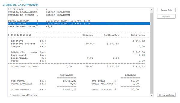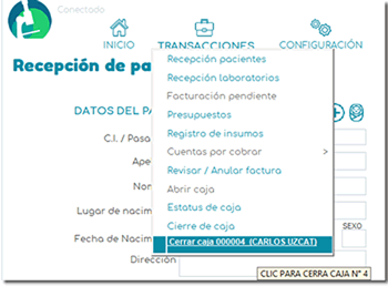 - Ingrese por el menú Transacciones/Cerrar caja (nombre del usuario)
