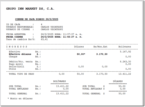 Al imprimir el reporte del cierre obtendrá un documento similar al que se ve en la siguiente imagen.
