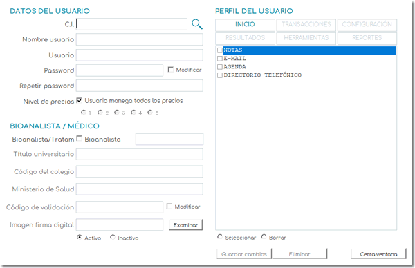 Si el usuario es bioanalista, continúe con Datos del bioanalista, de lo contrario, con Perfil del usuario.