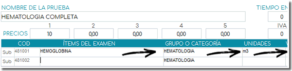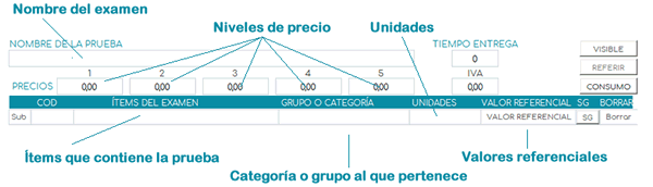 Aquí se mostrarán los campos donde debe ingresar el Nombre de la prueba, el precio, IVA (si aplica), Grupo o categoría a la que pertenece el examen, las unidades utilizadas.