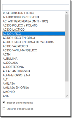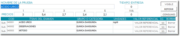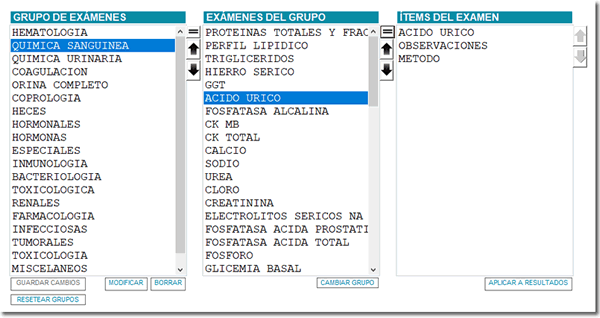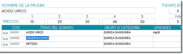 - Grupo o Categoría: todos los exámenes pertenecen a un grupo o categoría, por ejemplo, el Ácido úrico pertenece a la categoría Química clínica o Química sanguínea.