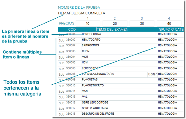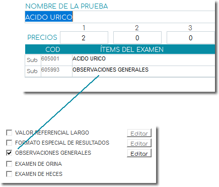 - Ítem del examen: en el caso de los exámenes compuestos o de múltiples líneas las líneas o ítems no llevan el mismo nombre del examen.