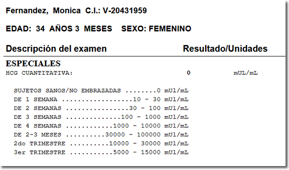 El sistema cuenta con una Alerta en el momento de la impresión de los resultados, imprimiendo de color rojo aquellos valores que se encuentren fuera del rango establecido, según la edad y sexo del paciente. Sin embargo, este cálculo solamente aplica si el valor referencial es numérico. |