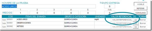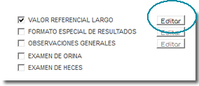 Haga clic sobre la etiqueta Valores referenciales en la línea que corresponde al examen.