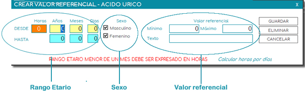 Para finalizar con el punto del rango etario debemos aprender cómo crear un valor referencial para pacientes de horas de nacidos. Para ello utilizaremos la casilla Horas e ingresaremos en ella hasta cuantas horas aplica el valor referencial.