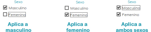 Aquí solamente debemos indicar si se trata de sexo masculino o femenino desmarcando la casilla a la que no aplica. Es decir, si deseamos que aplique solo a masculino, desmarcamo la casilla Femenino, o viceversa.