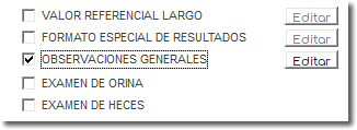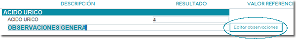 En el momento de la edición o carga de resultados, se mostrará un botón (Editar observaciones), que le permitirá realizar cualquier modificación al texto previamente configurado.