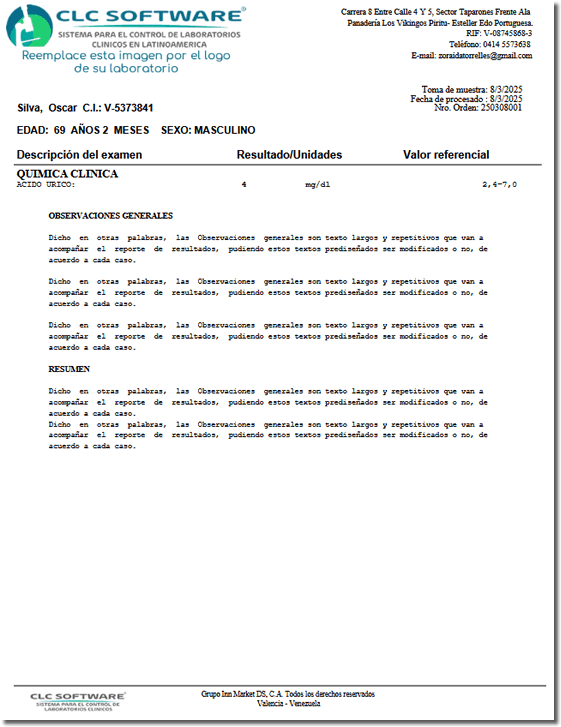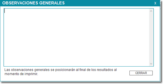 Dicho en otras palabras, las Observaciones generales son texto largos y repetitivos que van a acompañar el reporte de resultados, pudiendo estos textos prediseñados ser modificados o no, de acuerdo a cada caso.