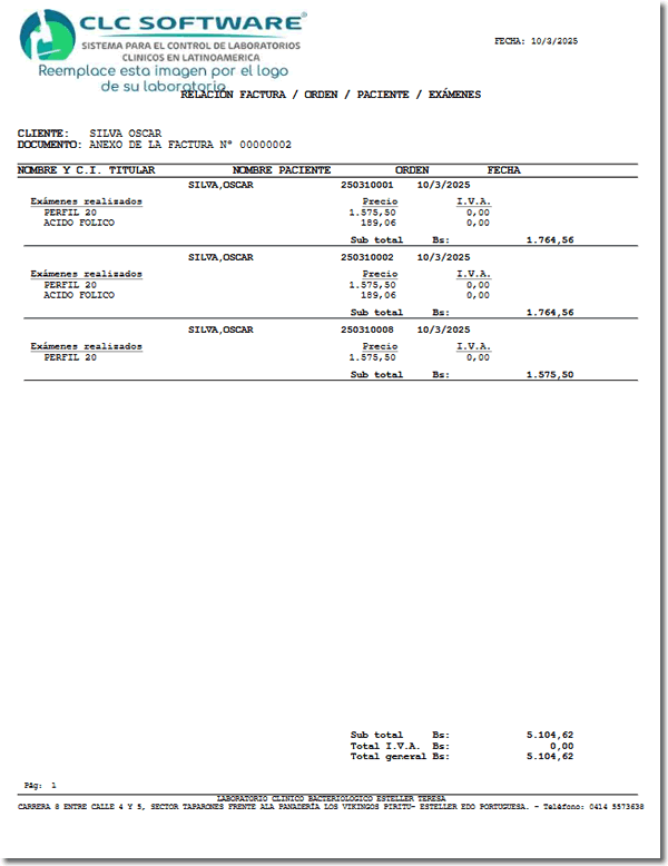 Este formato de facturación permite ahorrar espacio en la factura. Sin embargo, existen casos en que la cantidad de exámenes supera la capacidad de la hoja en que se imprimirá la factura. Para esos casos, lo recomendable es la opción de Compilación.