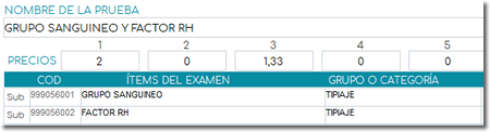 - Ubique y seleccione en la primera lista el examen GRUPO SANGUINEO.