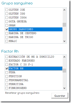 - Ubique y seleccione en la segunda lista el examen FACTOR Rh.
