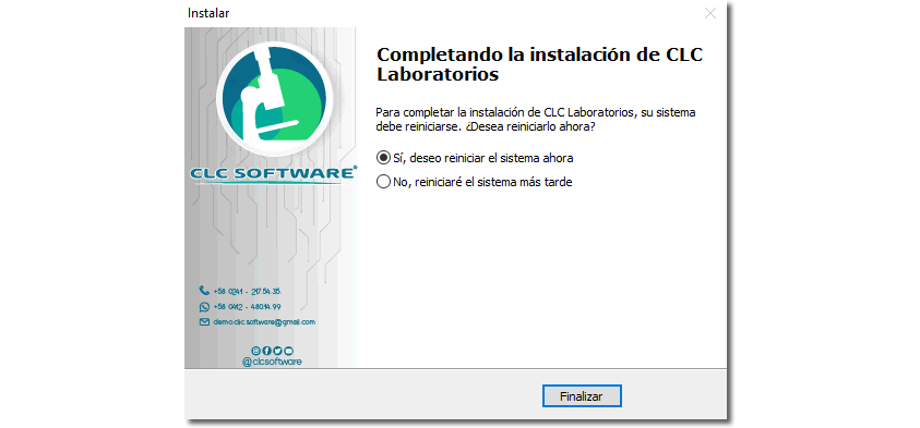 Si al finalizar la instalación no inicia CLC Laboratorios, puede comunicarse con soporte técnico a través del número +58 0414-4132841, telefónicamente o por WhatsApp.