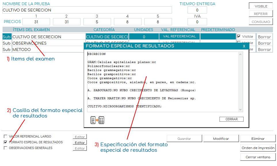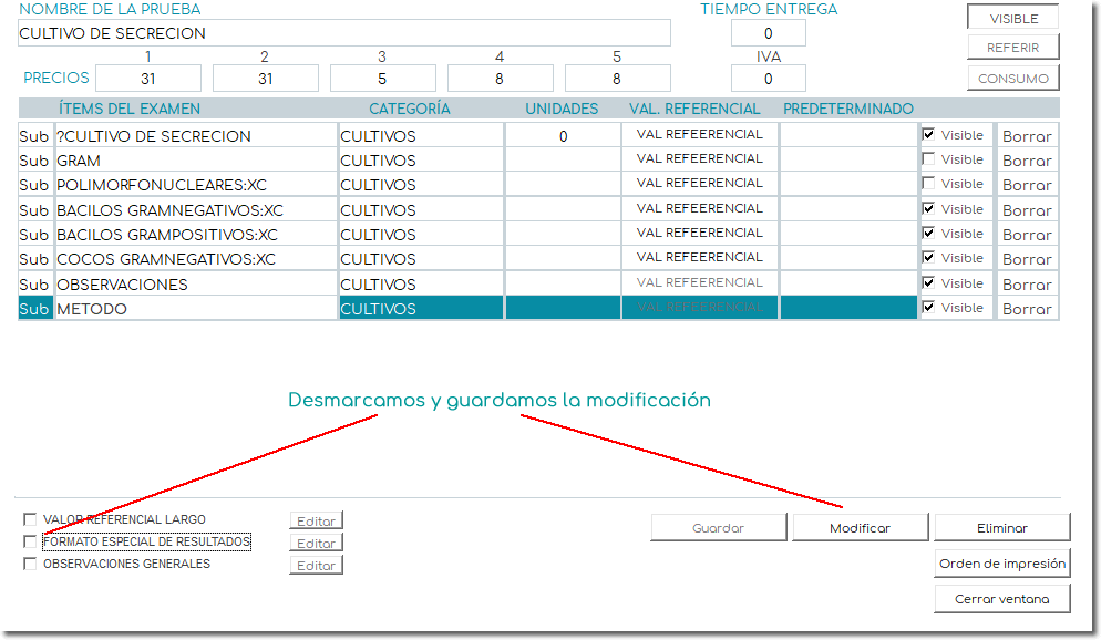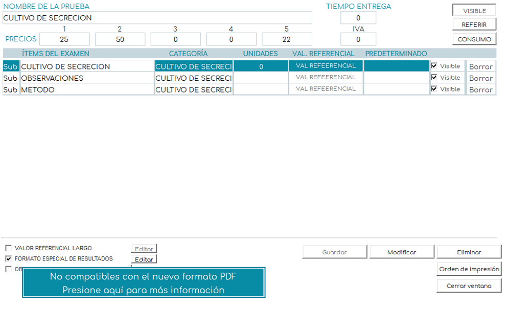 A partir de esta modificación este examen ya no será del tipo Formato especial de resultados, siendo que el mencionado formato ya no es compatible con CLC.