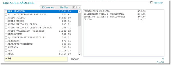 En el cuadro de la izquierda que se muestra en la imagen, vaya buscando y seleccionando los exámenes que este paciente requiere.
