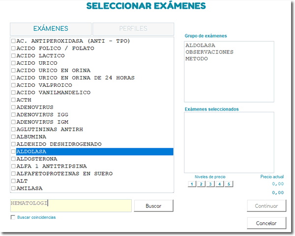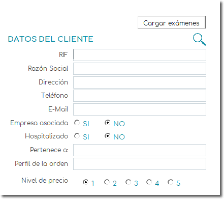 Los campos con fondo blanco son los requeridos por el sistema para emitir la orden de exámenes. Si desea personalizar esta opción e indicar cuáles campos desea que sea obligatorios y cuales no, consulte Datos requeridos al facturar