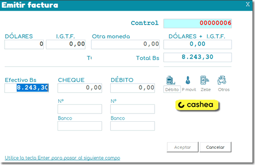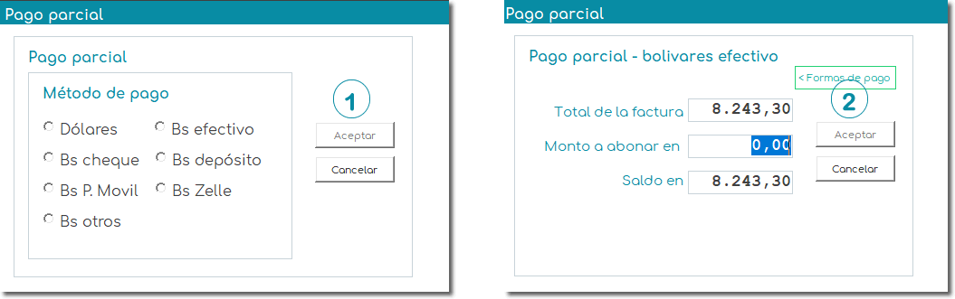 - Seleccione el método de pago, ingrese el monto y presione Aceptar